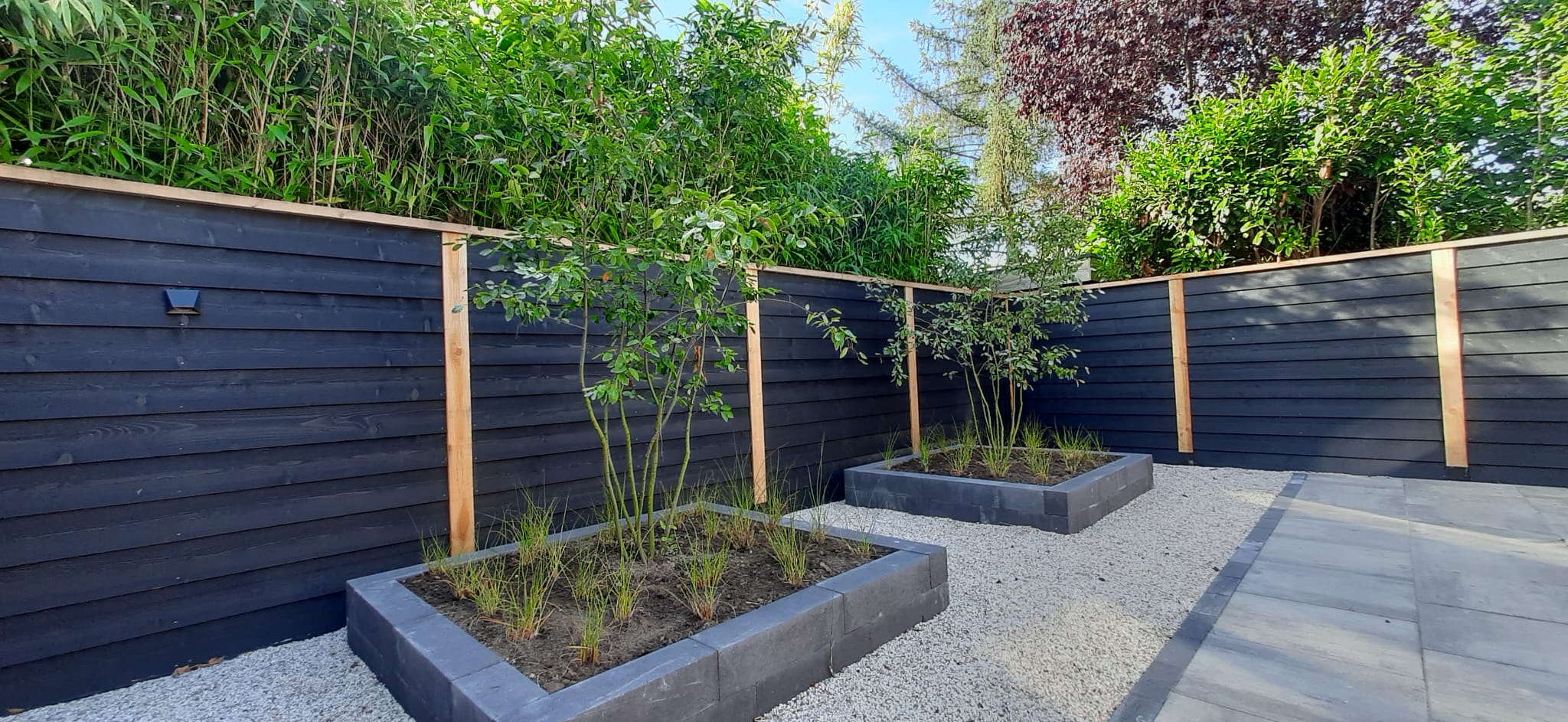 Rooien en afvoeren aanwezige beplanting / Afvoeren aanwezige bestrating / Plaatsen van Douglas schutting / Leveren en aanbrengen In-Lite Dark Wedge verlichting op de schutting / Leveren en aanbrengen nieuwe bestrating / Leveren en aanbrengen van verhoogde borders d.m.v. stapelblokken / Inplanten en afwerken van de tuin